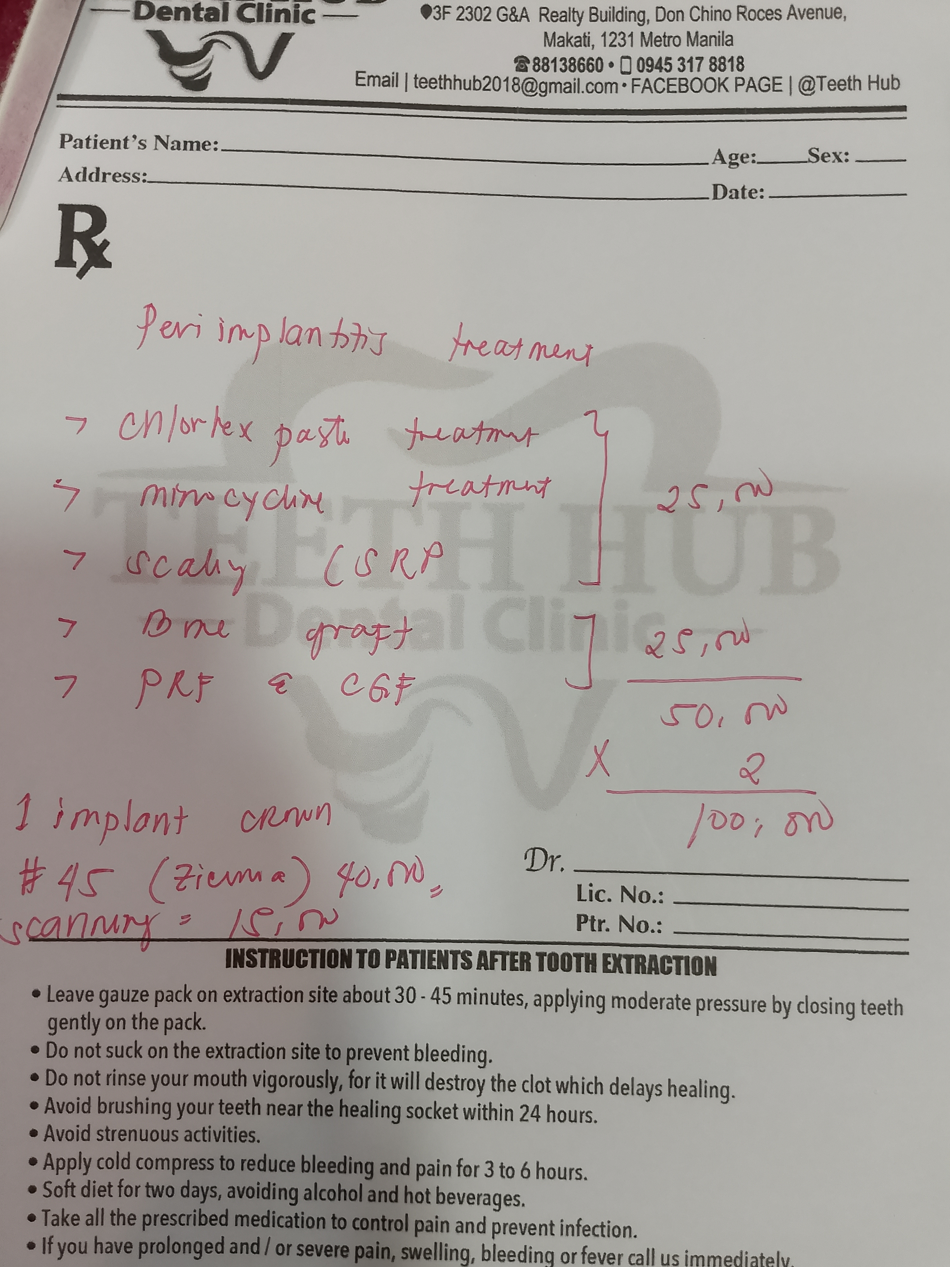 Edit Record Check our patient data records. Add patient information Patient Info Profile picture Last Name First Name Middle Name Birthdate Age Street Barangay City Country Zip Code Contact number Email Procedure 07/26/21- implant placement- 16-8.5mm 15-8.5mm/ 47/46/36/37 with prf/ cgf/ bone fillers 11/13/21 - 15 healing abutment installed- 3mm (6mm) 46/45 healing abutment installed- 6mm req for 3mm 12/17/21 - installation of abutments/ impression 12/22/21- PMMA 46/47/36/37 (12/29) final impression 2/3/22 - 4 implants 4.3x10mm lateral sinus lift LEFT 05/07/22- OP with ozone PA xray 05/13/22 recementation 22 veneers 05/31/22- Redo 23 Veneers PFZ- Temporary ***for healing abutment implants 08/12/22- installation of healing abutments 9/6/22- scan body/ intra oral scanned ***request for alginate impression *** shade A3 cervical A2 body 10/07/22- installed 4 units 24/25- with pink porcelain crown 26/27 ameloplasty mesial of 28 abutment sealed with TF Zirconia crown- screw retained 12/17/22- OP 05/13/23- xray/ozone 09/23/23- OP/AIRPOLISHER XRAY 10/13/23 -RCT #41 - flexion root opening - dressing formocresol 10-27-23- RCT #41 18.5 mm Champenol Flexion root 11-03-23- Obturation #41 MTA Fillapex, Master wire = fine 11/10/23 # 43 - veneer; emax # 42 - veneer; emax # 41 - crown; PF Z # 31 - veneer; emax # 32 - veneer; emax shade A3/ B2 11/17/23- Installation of Veneers- 43,42,31,32 (emax) Crown Zirconia- 41 Cement: choice 2 Prosapac Vacummed sheet retainer 05/25/24 OP w/ air polisher 03/29/25 OP w/ air polisher LC #42 (I) cementation repair veneer 06/13/25 Upper #23-PFZ Lower # 32,33- Zirconia bal.70k 06/18/25 installed PFZ crown #23 zirconia crown #33,#32 bal,. paid 08/08/25 Dx:peri implantitis #44/15 moldable bone-HUBT .m30 w/PRF #44 implant moldable bone HUBT .m30 w/ PRF #15 scaling and planning disinfect w/ citric acid irrigate w/ citric acid Rx: Celecoxib 400mg Tranexamic 500mg Co amoxiclav 625mg, Orahex Prednisone 10mg for 10 days 02/24/26 LC on iplant #25-Occ #23- Recement veneer 02/25/26 Repair File 01cb0af9-a7ec-487f-a76f-2b7aa0463be3.jpeg File 2 9941df4f-eadd-49c9-a9ad-b0f3e6f2052a.jpeg File 3 2d4f20db-c762-4f0e-9fe3-4a3ecc7b62c0.jpeg File 4 a55f6852-691c-4c51-ad5c-f6f58a1f269c.jpeg File 5 a965f478-086f-4edc-bdde-4c4f9bcd41ff.jpeg File 6 d31d3680-98bc-43a6-bcb1-c3d0d4b8c1c5.jpeg File 7 roleenxray.jpg File 8 roleen_del_prado.jpg File 9 rollen_del_prado_02.jpg File 10 rpleen_del_prado_04.jpg File 11 1000005163.jpg File 12 File 13 File 14 File 15 File 16 File 17 File 18 File 19 File 20 Retain Record Retain Record Yes No Save Your Changes