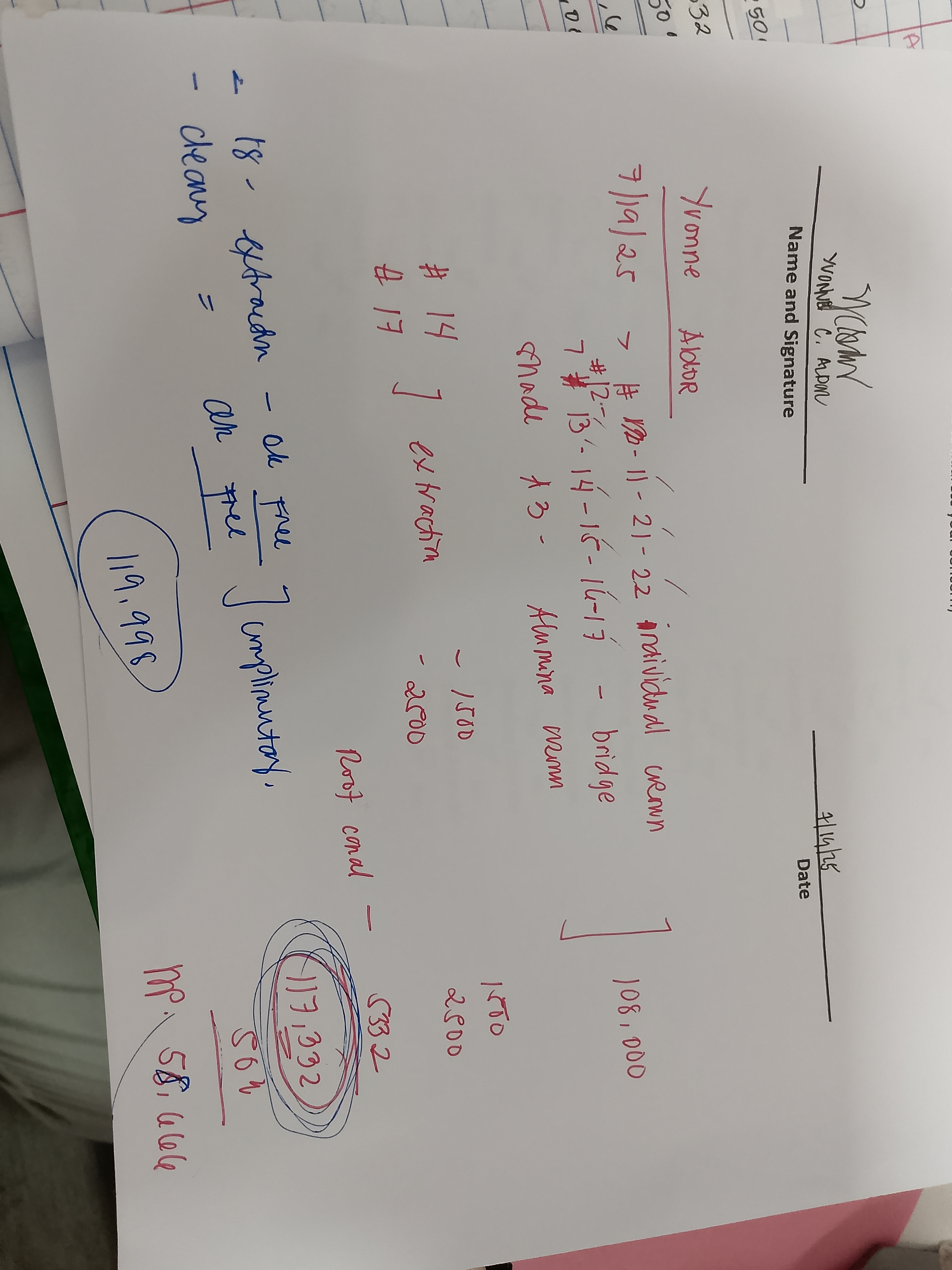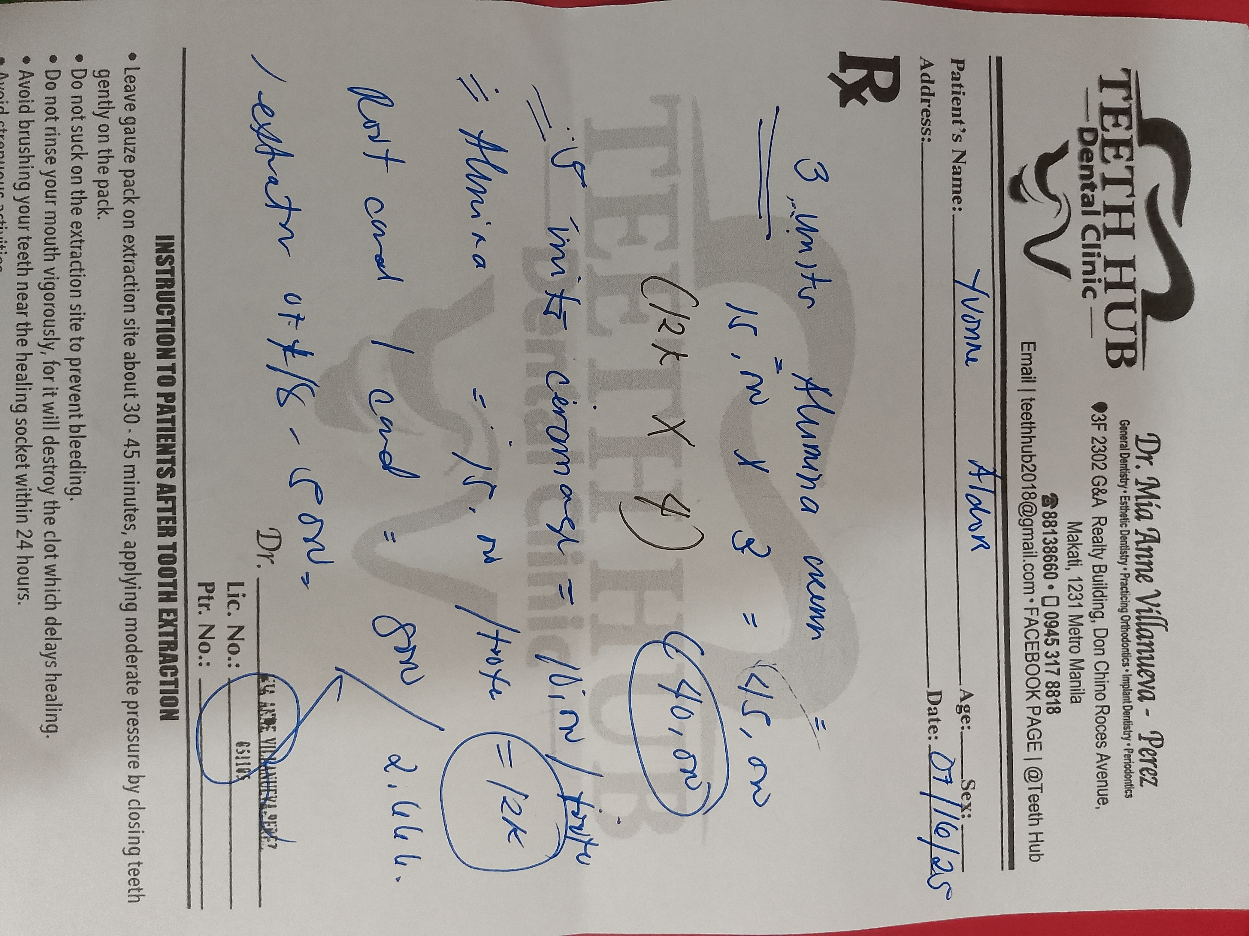 Edit Record Check our patient data records. Add patient information Patient Info Profile picture Last Name First Name Middle Name Birthdate Age Street Barangay City Country Zip Code Contact number Email Procedure 07/16/25 RCT #22-22mm dressing Eugenol 2,666 per session bal.5,332 ***next meeting RCT, Temporary crown, Exo 07/19/25 #11, 21, 22 individual crown #12, 13, 14, 15, 16, 17 bridge shade A3 alumina crown #22 RCT #14, 17 EXO 07/26/25 Obturate #22-18mm one fill- 30 master cone installed alumina crown 11, 12, 22- individual crown fixed bridge 12-13-14-15-16-17- shade: A3 cervical/ body A2 op- air polisher for extraction: 18- paid 08/02/25 Exo #18 File 1000005473.jpg File 2 1000005472.jpg File 3 1000005536.jpg File 4 File 5 File 6 File 7 File 8 File 9 File 10 File 11 File 12 File 13 File 14 File 15 File 16 File 17 File 18 File 19 File 20 Retain Record Retain Record Yes No Save Your Changes