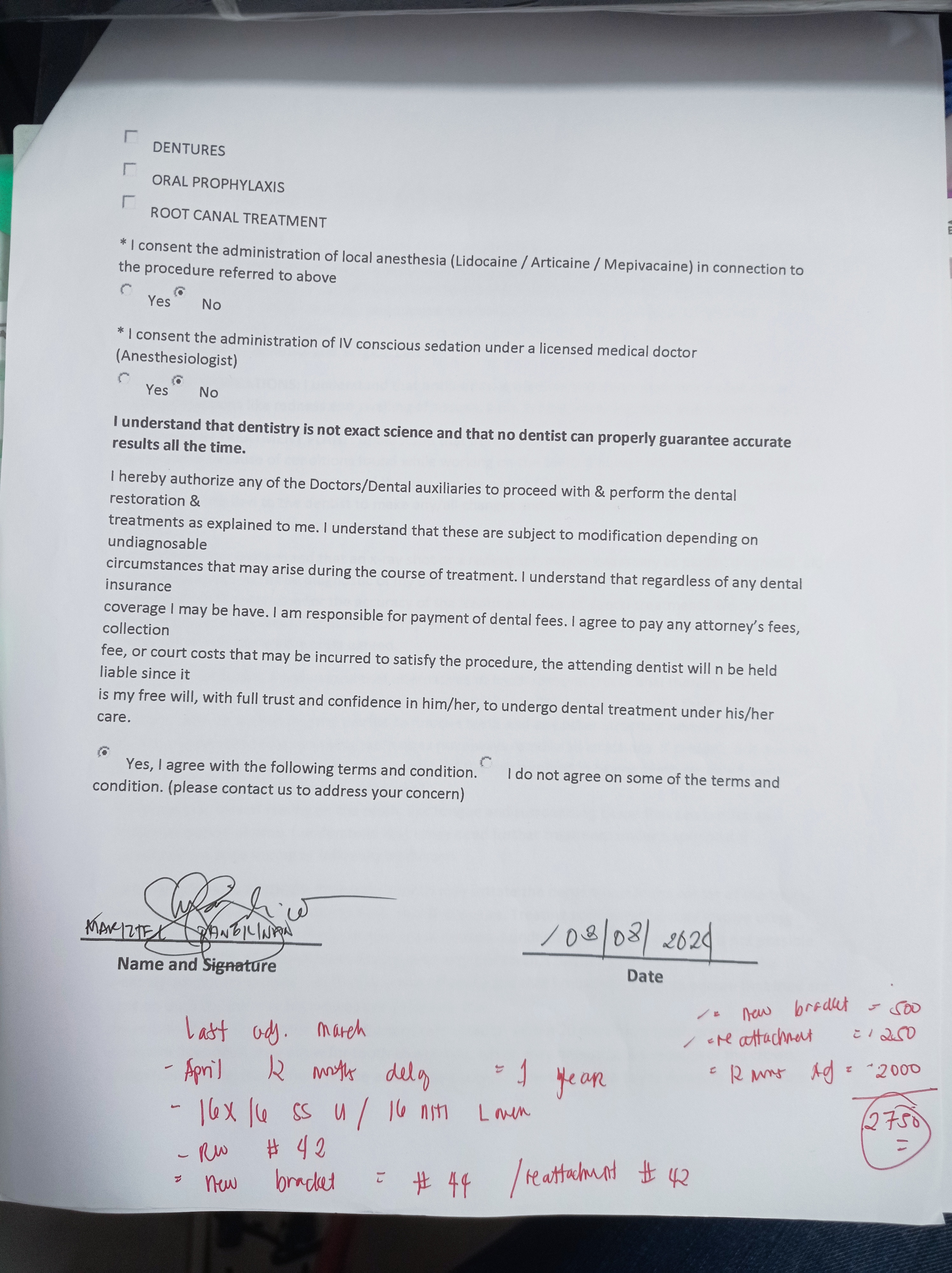 Edit Record Check our patient data records. Add patient information Patient Info Profile picture Last Name First Name Middle Name Birthdate Age Street Barangay City Country Zip Code Contact number Email Procedure 02/11/21 change power o stripping 43-34 wedge (rotational) #42, 34 recement #26 bu tube xray #37 #37 with periapical infection, advise for RCT 9/10/21- 18ssUL close bite on Left Q 11/23-/21- 18ss UL- RW 21/ 31 req cephxray 3/29/22- 5/11/22- 18 ss UL/ 3 to 3 fox ***11 for reposition ***4 anterior teeth for extrusion 9/13/22 - Reposition 11, U 16Niti, 3to3 Fox 01/04/23- ADJ/1REATTACHED 03/30/23- 16x16 SS U/ Same wire L/ #45 Reattached RESTO #38-0,16-0,26-0 last adj. May 03/08/24 -april 12 months delayed= 1year -16x16 ss U/ 16 niti lower -RW #42 -new bracket #44/ reattachment #42 07/06/24 Adj 16x16 NITI L new bracket #36,#45 LC #36 M #44 O 08-09/14/24 ADj 11/09/24 removal of brace with retainer File 302093077_782738549436849_9016652906456315613_n.jpg File 2 303372856_492246838900821_3603930778862532517_n.jpg File 3 img_20240308_150047.jpg File 4 File 5 File 6 File 7 File 8 File 9 File 10 File 11 File 12 File 13 File 14 File 15 File 16 File 17 File 18 File 19 File 20 Retain Record Retain Record Yes No Save Your Changes
