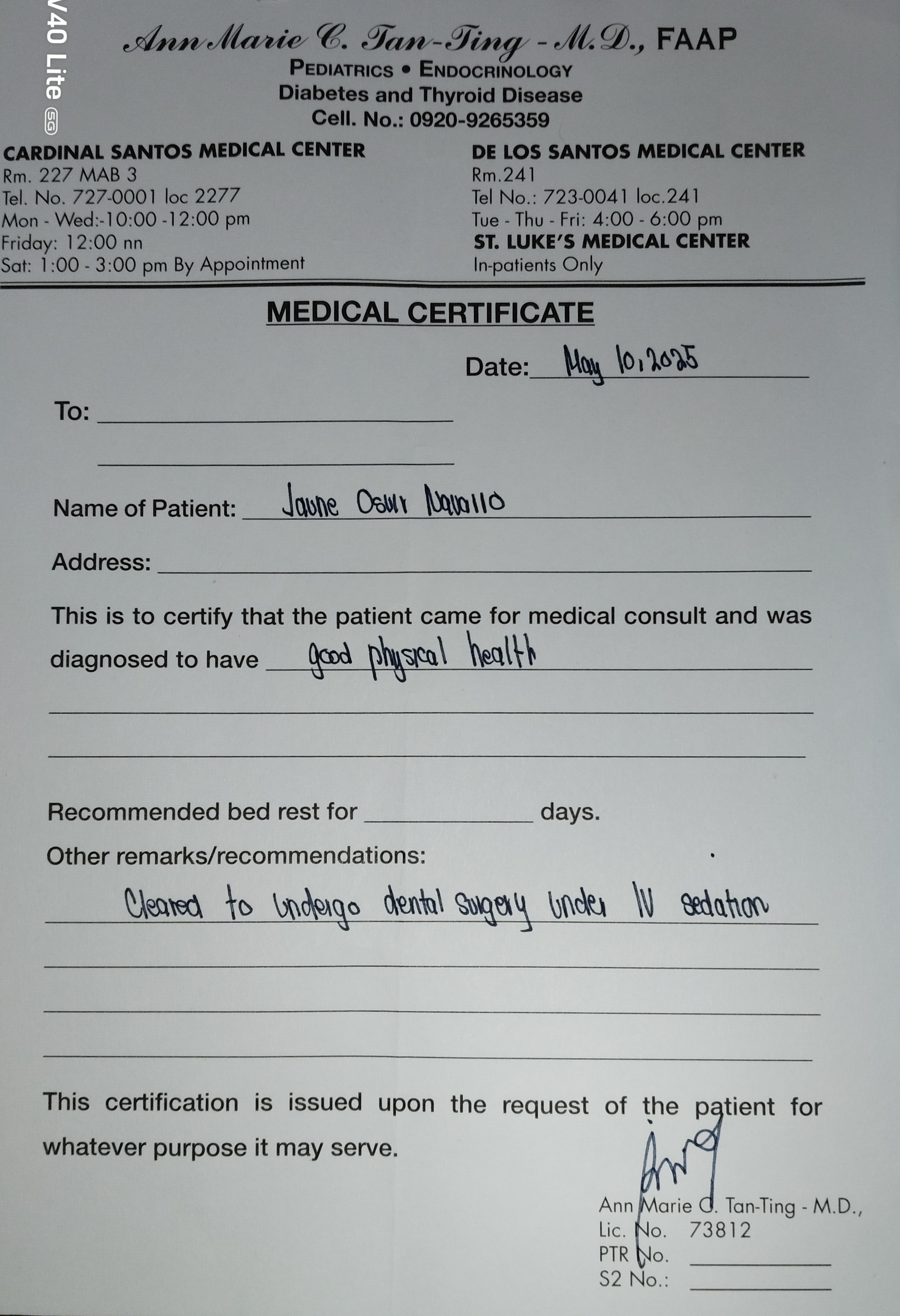 Edit Record Check our patient data records. Add patient information Patient Info Profile picture Last Name First Name Middle Name Birthdate Age Street Barangay City Country Zip Code Contact number Email Procedure 5/21/22- OP & LC #26 OB #36 OL 4/29/23- Exo/Sealant3/ 07/05/23-impression intra oral photos OP (no extra oral photos yet) 07/11/23- /installation upper braces/roth .22 niti 14 niti Frenectomy- diode laser/tongue tie 07/25/23- Installation of lower brackets 14 nit LC #37-Occ #47-Occ + Buccal #24-Occ 08/08/23- adjust 09/02/23- adjust 10/07/23- 18 Niti U/L reposition #23 11/11/23- 16 SS Upper 16 SS Lower, Chain #41-32, Extrude #33 12/22/23- 18 niti U with wire bendings on 21/ 22/23 same wire lower 03/16/24 same wire RW #12 04/12/24 New Bt #36 Adj 16 SS U 18 SS L RW #33- distal 05/18/24 adj 16x16 NiTi L 16x16 SS U elastic rabbit 06/15/24 same wire IPR #11/21/22/12 class II elastic chipmunk 07/16/24 16X22 SS U 16 NITI L 08/10/24 #45 new bracket 16 SS L same wire chain U 09/07/24 16x16 SS L class III elastic chipmunk 10/12/24 ADJ chain upper new buccal tube #36 tentative removal; march/april 11/09/24 same wire chain upper 12/20/24 new buccal tube #26 reattach #25 (new) rabbit 3.5 oz 01/25/25 adj same wire cross elatic-penguin 2nd pm to 3rd 02/22/25 Adj canine to canine chipmunk posterior to posterior rabbit 5oz 03/29/25 Adj crimpable hook class II elastic rabbit 5oz for removal nxt month 04/26/25 removal brace w/ free retainer 05/17/25 ODontectomy #18,48 w/ IV CS Rx: clindamycin 300mg/ celecoxib 05/23/25 suture removal 06/03/25 Odontectomy #28,#38 Rx: prednisone. B complex, celecoxib 200mg, IV CS 06/10/25 LC #22 Mesial,facial File jaunne_osvir.jpg File 2 file_0001_2_1.jpg File 3 1000006361.jpg File 4 1000006360.jpg File 5 1000006359.jpg File 6 1000006358.jpg File 7 1000006354.jpg File 8 1000006353.jpg File 9 File 10 File 11 File 12 File 13 File 14 File 15 File 16 File 17 File 18 File 19 File 20 Retain Record Retain Record Yes No Save Your Changes