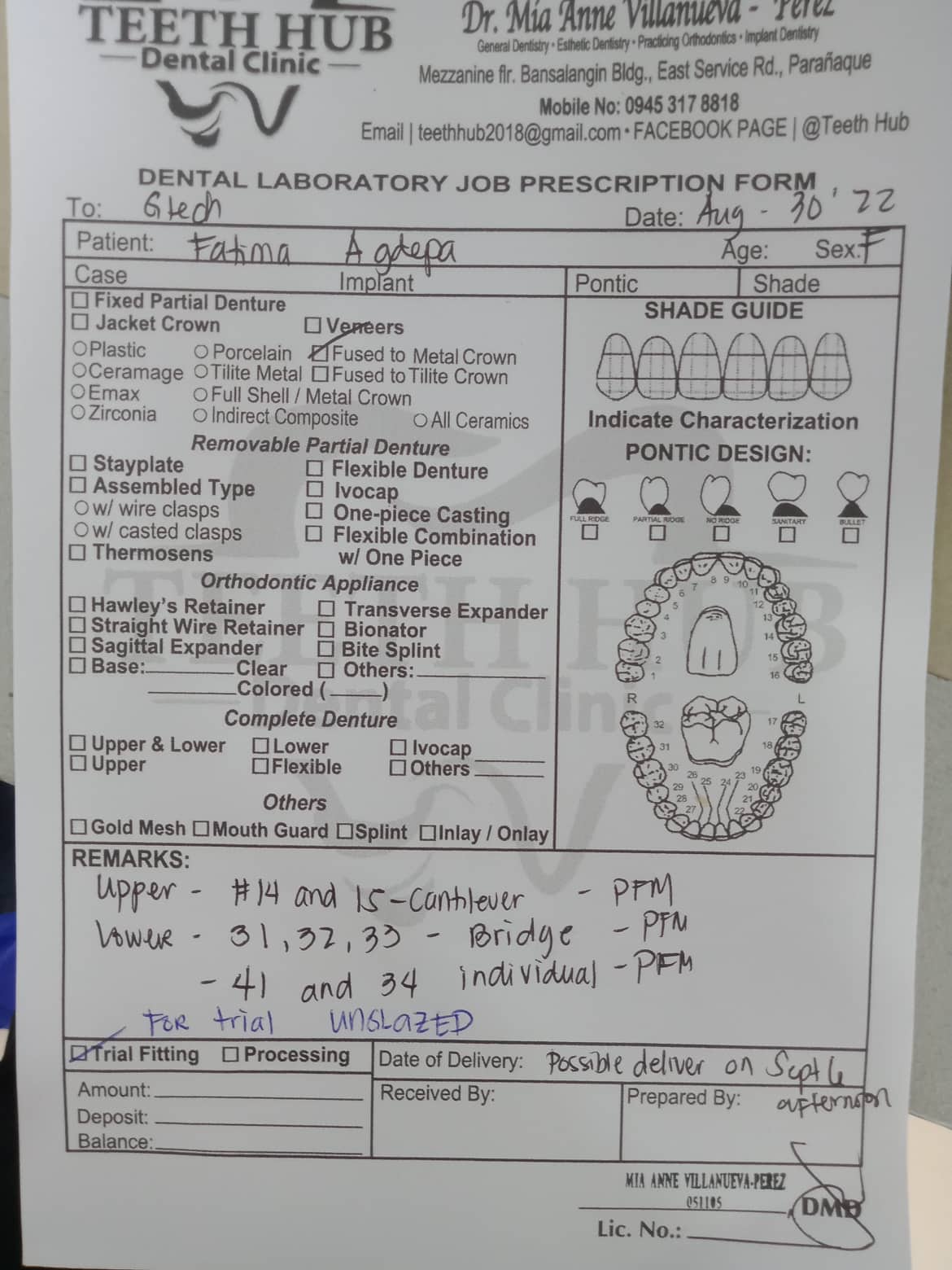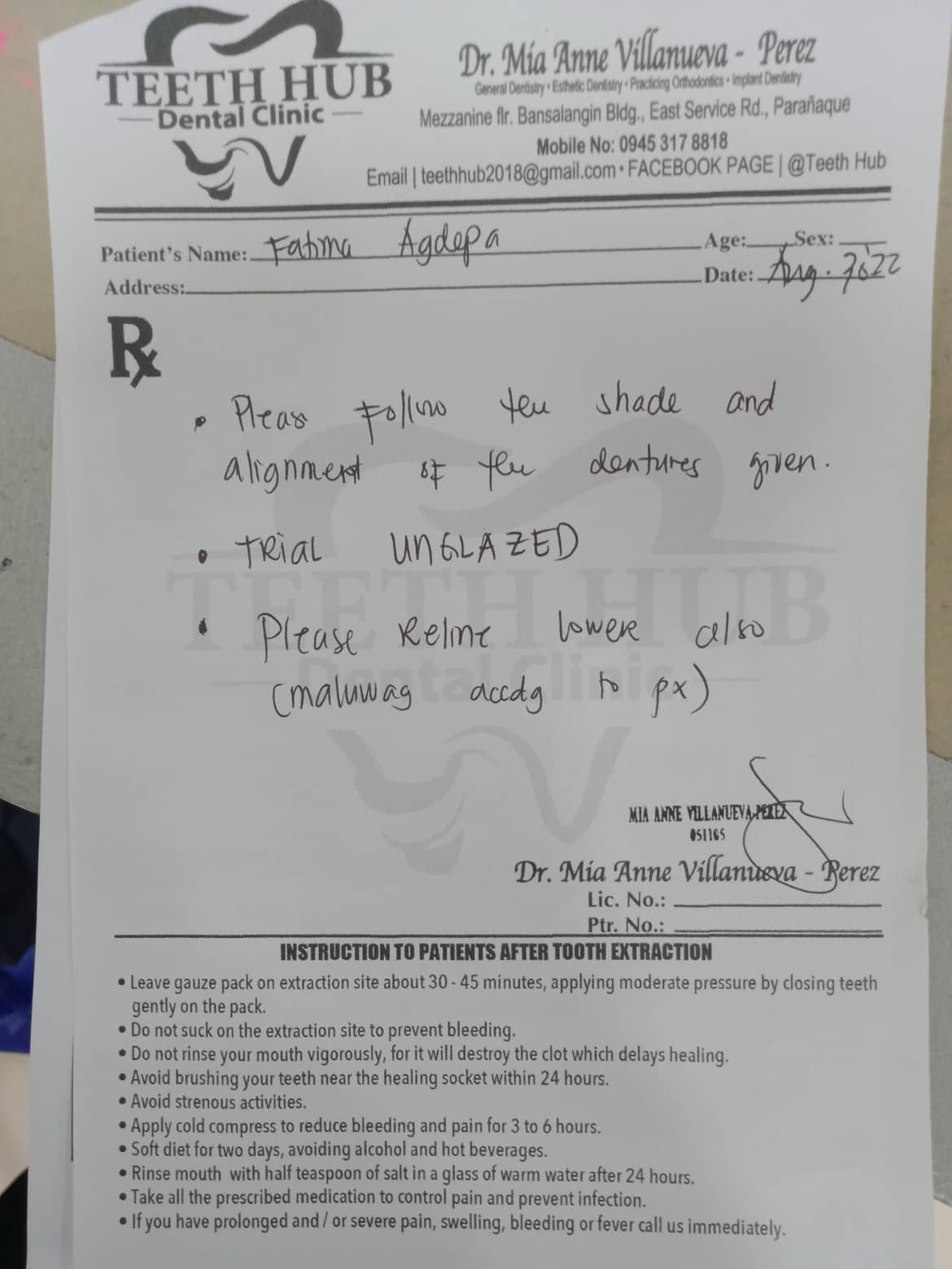 Edit Record Check our patient data records. Add patient information Patient Info Profile picture Last Name First Name Middle Name Birthdate Age Street Barangay City Country Zip Code Contact number Email Procedure 3/18/22- check up/request for pano and cbct 03/29/22- IV CS 15 Exo # 41 RCT 8 lidocaine with laser Hemostasis 04/06/22- suture removal RCT 41- formocresol 4/8/22 - 20mm campHENOL FILE 04/22/22 - irrigate. dressing CAOH with barium for obturation 6/10/22 - Ints. Of Dentures U/L IVOCAP recall after a week 08-30-2022 > UPPER #4 AND #15 - CANTILEVER - PFM > LOWER 31,32,33, - BRIDGE - PFM > #41 AND 34 INDIVIDUAL- PFM (FOR TRIAL UNGLAZED) > RX : PLEASE FOLLOW THE SHADE AND ALIGNMENT OF THE DENTURES GIVEN. > TRIAL UNGLAZED > PLEASE RELME LOWEER ALSO (MALUWAG ACCDG TO PX) 02/01/23 UPPER&LOWER DENTURE File 301740367_752091116087312_6047312947102650902_n.jpg File 2 301741748_378425624459133_2764335481472559812_n.jpg File 3 fatima_agdeppa.jpg File 4 fatima_agdeppa_02.jpg File 5 fatima_agdeppa_03.jpg File 6 File 7 File 8 File 9 File 10 File 11 File 12 File 13 File 14 File 15 File 16 File 17 File 18 File 19 File 20 Retain Record Retain Record Yes No Save Your Changes