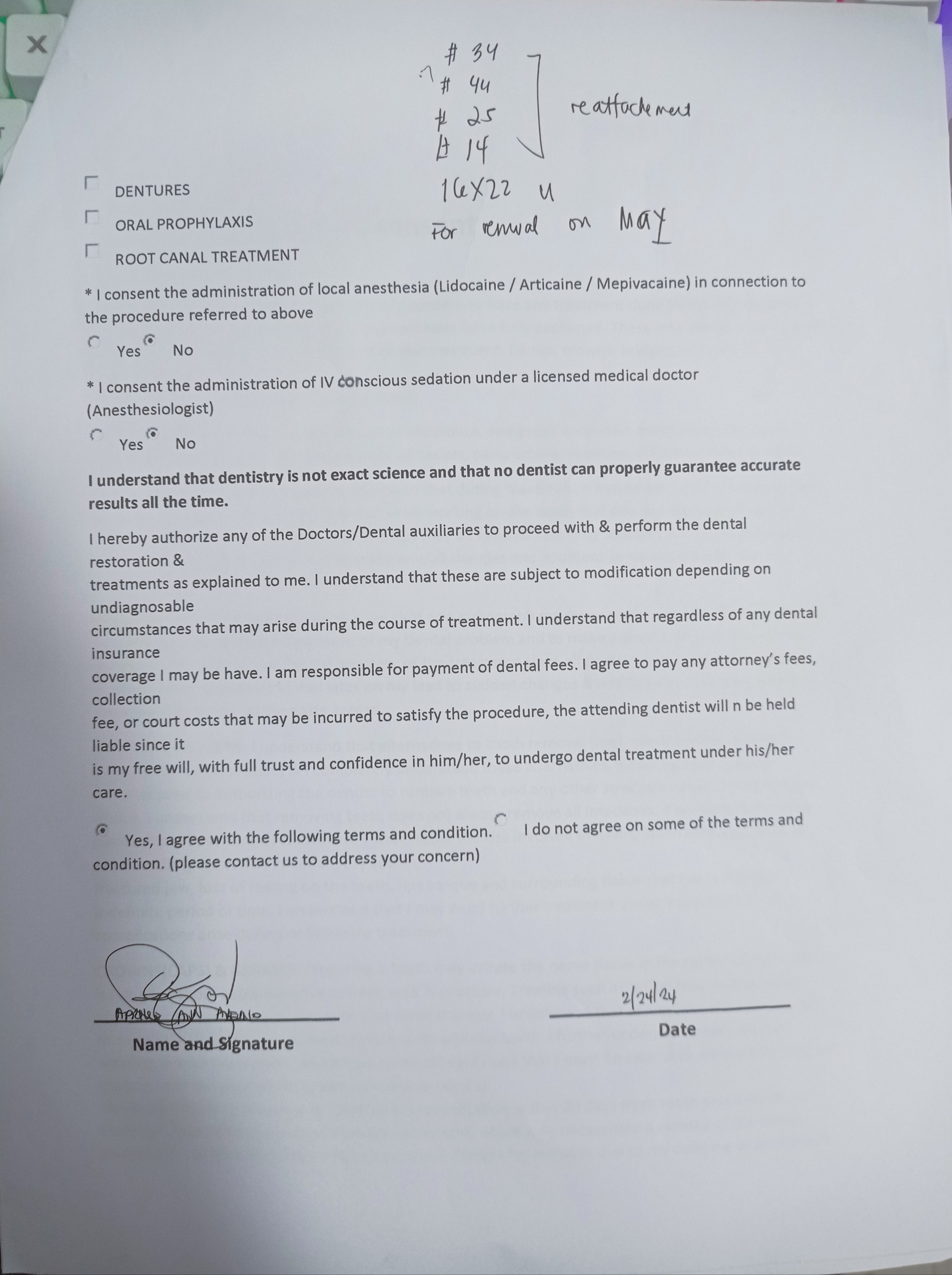 Edit Record Check our patient data records. Add patient information Patient Info Profile picture Last Name First Name Middle Name Birthdate Age Street Barangay City Country Zip Code Contact number Email Procedure 07/224/21- U16ss/ L16niti/ Uchain ant/ L ind 09/4/21- 16ssU/18nitiL cross elastic- lower left to right penguin 10/23/21 - 16ssU/16ssL class 3 elastic rabbit *req for 47/37 molar band 11/30/21- ADJ SAMEWIRE/ CLASS3 ELASTIC PENGUIN 1/15/22- 18SS U , 16SSL ,chain 23-25,44-45 Monkey - 13-15 to 43-44 Monkey - 23-25 to 33-34 3/19/22- fox 13-14-15 to 43-44/ 23-24-25 to 33-34/ 18 ss ul 5/3/22- ADJ 06/04/22- ADJ SAME WIRE, CHAIN 33-35 BOX ELASTIC R quad/ reattcahed 24/ 45 07/29/22 - U/L Revert to 0.016 Niti; removed ligature wires; Recement 15 and 45 brackets 9/3/22-U/L 18 ss ligature wire lower 32 bend Up 10/22/22 - UL SAME WIRE, INDIV, RESTO #16, #27 01/28/23- same wire 1 reattached 11/30/22-adj 1/27/23-ADJ/1reattached /05/20/23- OP/adjustment /reattached 33/ligature wire 12 to 22 coil spring mesial of 31 and 41 07/08/23- Reattached #34/35/chain 32-31-41-42 ind. power O- Upper 08/12/23- 16*16 ss UL/Ligature wire Lower 09/16/23- same wire Box elastic Fox ** for removal (January) 10/21/23- Same wire, closing spaces UL perio case 01-06-24 ADJ Reattachment #34 & #44 16x22 U SS (chain) 16x16 L SS 02/24/24 Reattachment #34,44,25,14 16x22 u For removal on May 04/20/24 for removal on May same wire chain U/L 06/15/24 removal of Brace lingual retainer U/L clear retainers U/L File april_avelino.jpg File 2 april_ann_avelino.jpg File 3 File 4 File 5 File 6 File 7 File 8 File 9 File 10 File 11 File 12 File 13 File 14 File 15 File 16 File 17 File 18 File 19 File 20 Retain Record Retain Record Yes No Save Your Changes