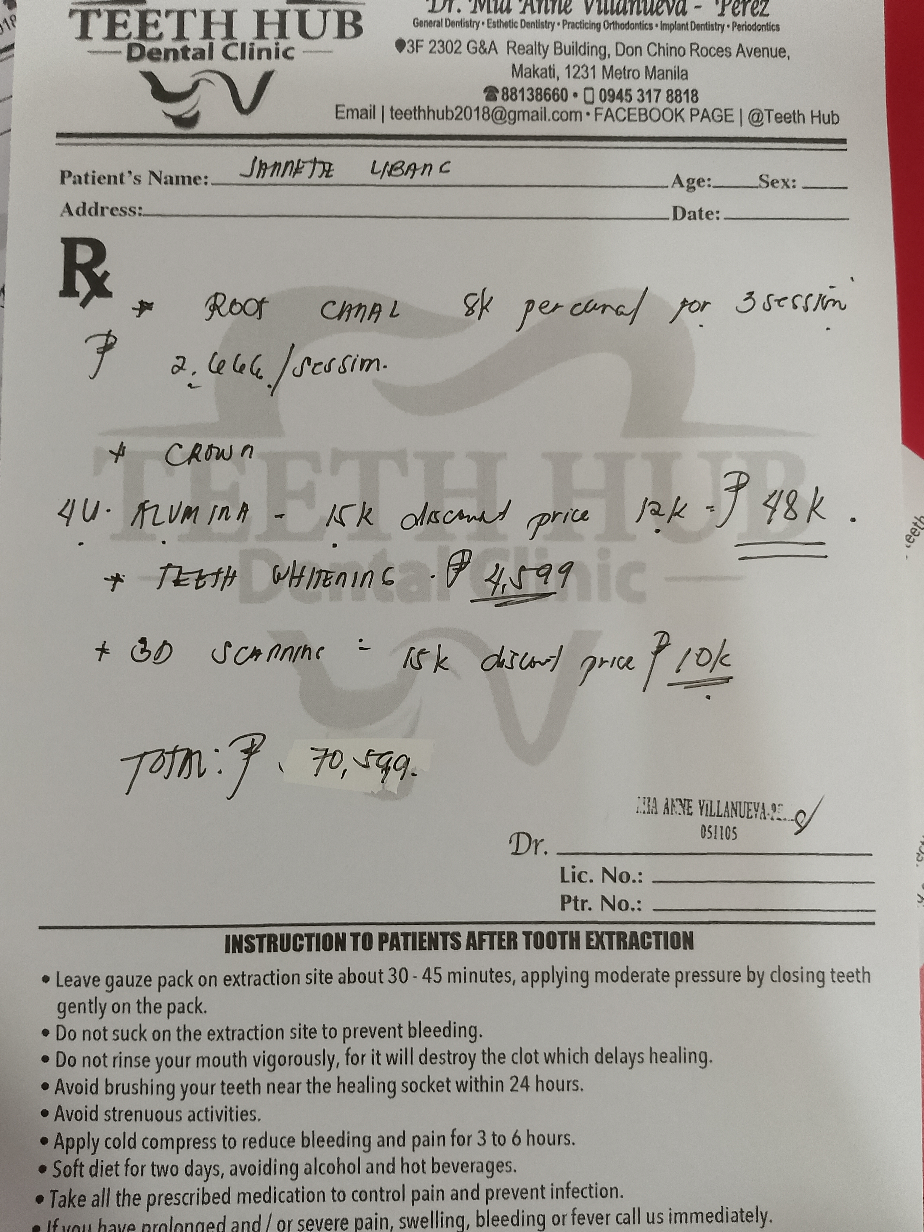 Edit Record Check our patient data records. Add patient information Patient Info Profile picture Last Name First Name Middle Name Birthdate Age Street Barangay City Country Zip Code Contact number Email Procedure 09/06/25 OP xray RCT #12-19mm 8k per canal for zirconia crown 4 units tooth #12,11,21,22- Php 80k 3D scan- Php 10k teeth whitening- Php 4,599 total Php102,599 DP-10,000 Bal. 92,599+800 x-ay Php93,399 09/12/25 RCT 12 file #35 Caoh DP 20,000 Bal. Php73,399+2,000=75,399 09/19/25 FRENECTOMY 4U UNITS ZIRCONIA SHADE: B2 BODY, B3 CERVICAL DP-25K BAL-50,399+750=51,149 09/25/25 4 UNITS ZIRCONIA LC #13 M 51,149+750=51,899 DP 40,000 BAL.11,899 10/09/2025 teeth whitening initial shade: upper C4, lower A4 final/new shade: upper C2, lower A2 10/15/25 LC #46 - occ, distal LC #15 + caoh - occ, lingual LC #16 - occ, lingual #24 - temporary filling anesthesia xray 10/22/25 LC #24 class II - M,O,D LC #15 - cervical File 1000005938.jpg File 2 1000012948.jpg File 3 1000012949.jpg File 4 File 5 File 6 File 7 File 8 File 9 File 10 File 11 File 12 File 13 File 14 File 15 File 16 File 17 File 18 File 19 File 20 Retain Record Retain Record Yes No Save Your Changes