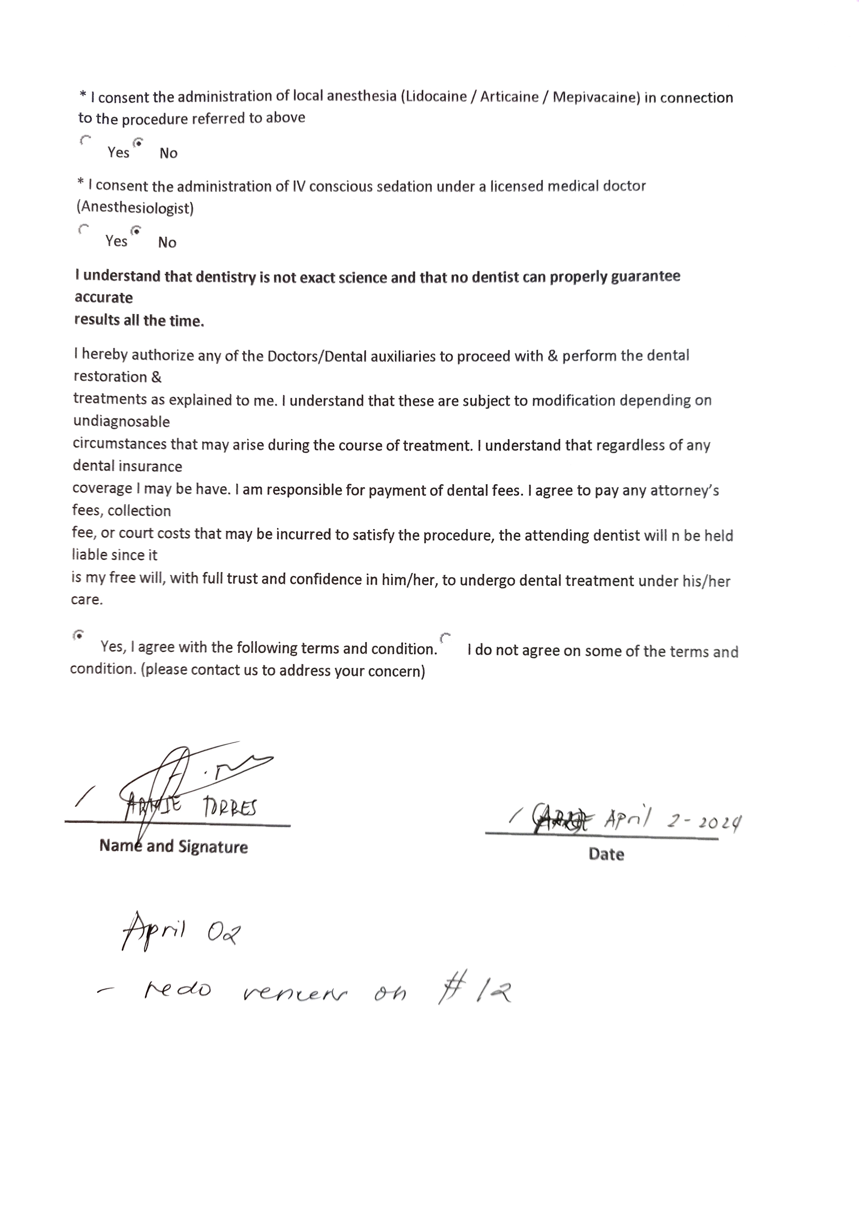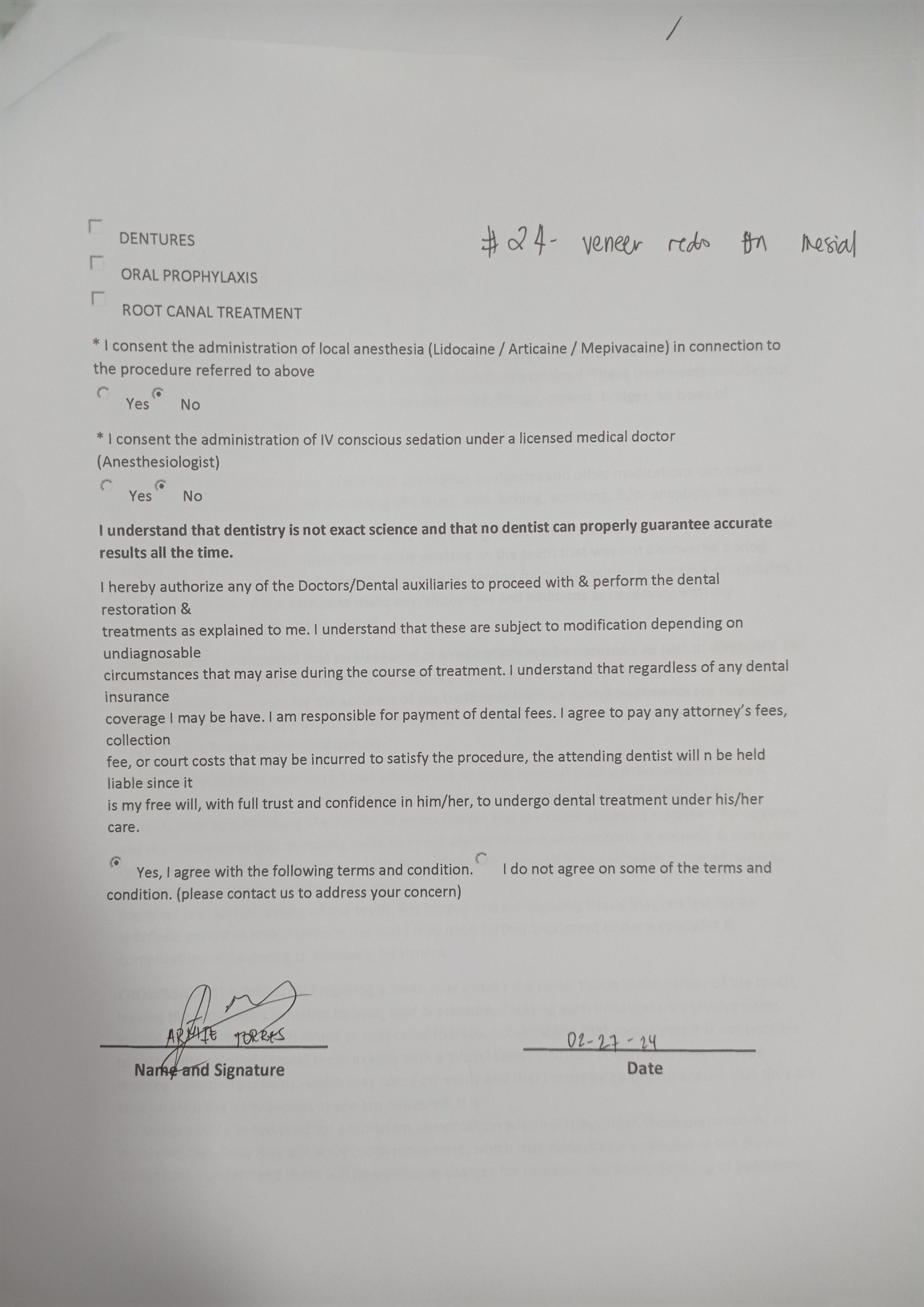 - 12/19/23- 8 Units veneers shade A2/ B2 with cleaning and polishing LC#24- Occlusal 1/5/24- redo 21 on mesial part 02/14/24 LC #37 o #47 o #16 o, m #25 o CaOH 02/27/24 -#24 veneer redo on mesial 04/02/24 redo veneer on #12