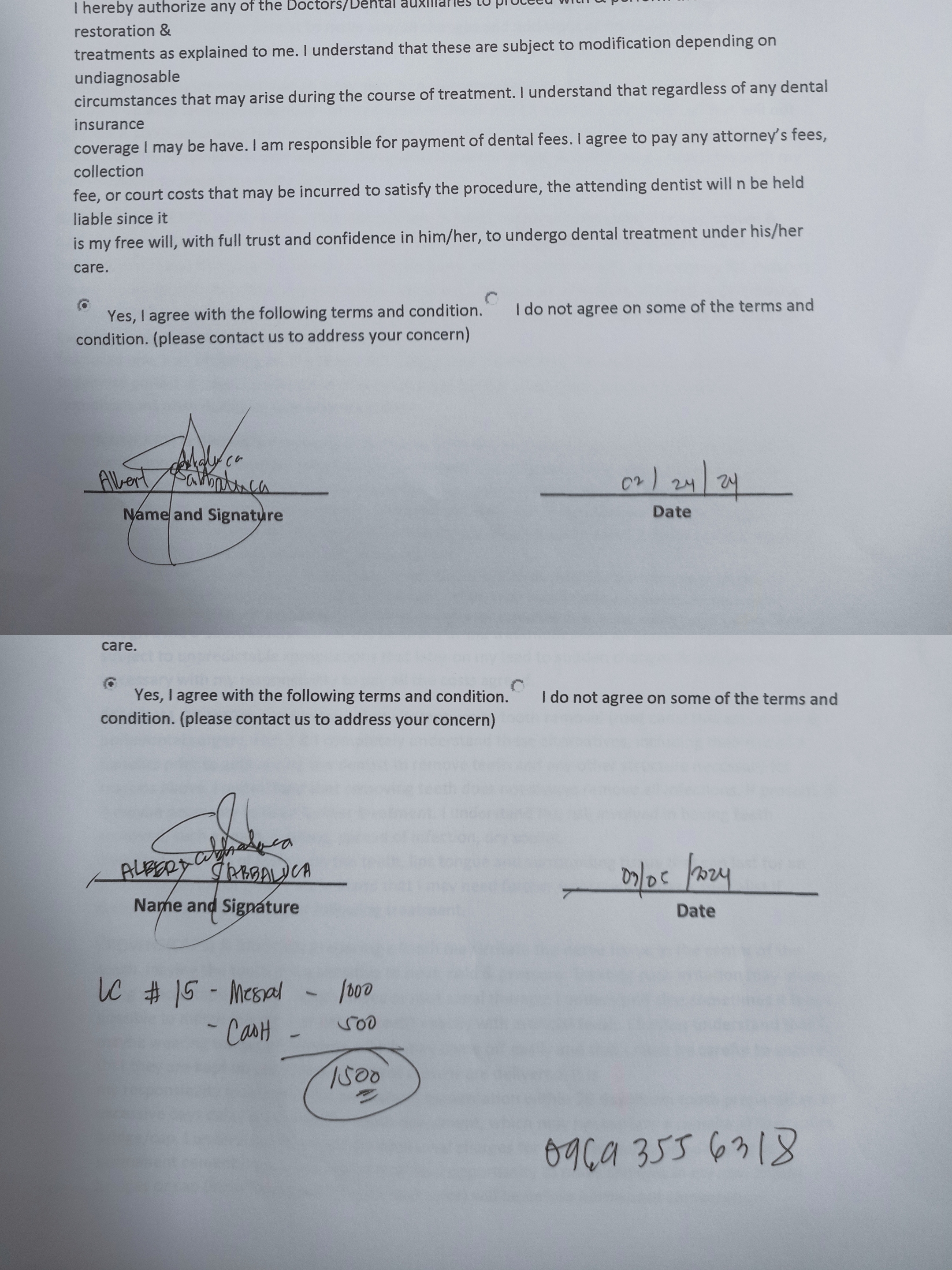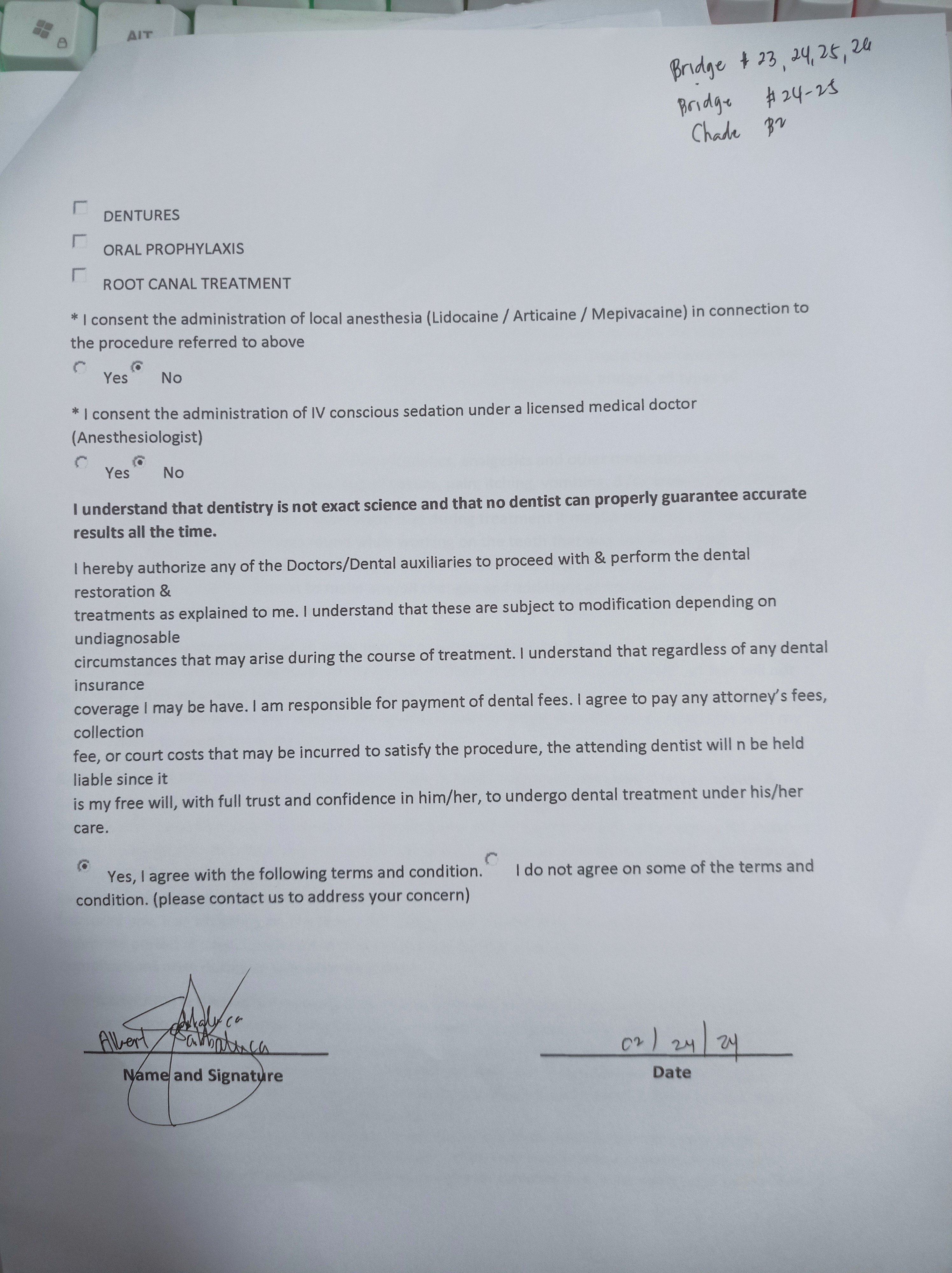 - 01/19/24 veneers shade B2/A1 OP 02/24/24 Bridge #23,24,25,26 Bridge #24-25 shade B2 03-05-24 LC #15-mesial + Caoh Installed # 14-15 alumina crown #23 to #26 alumina crown 09/21/24 OP veneer polishing