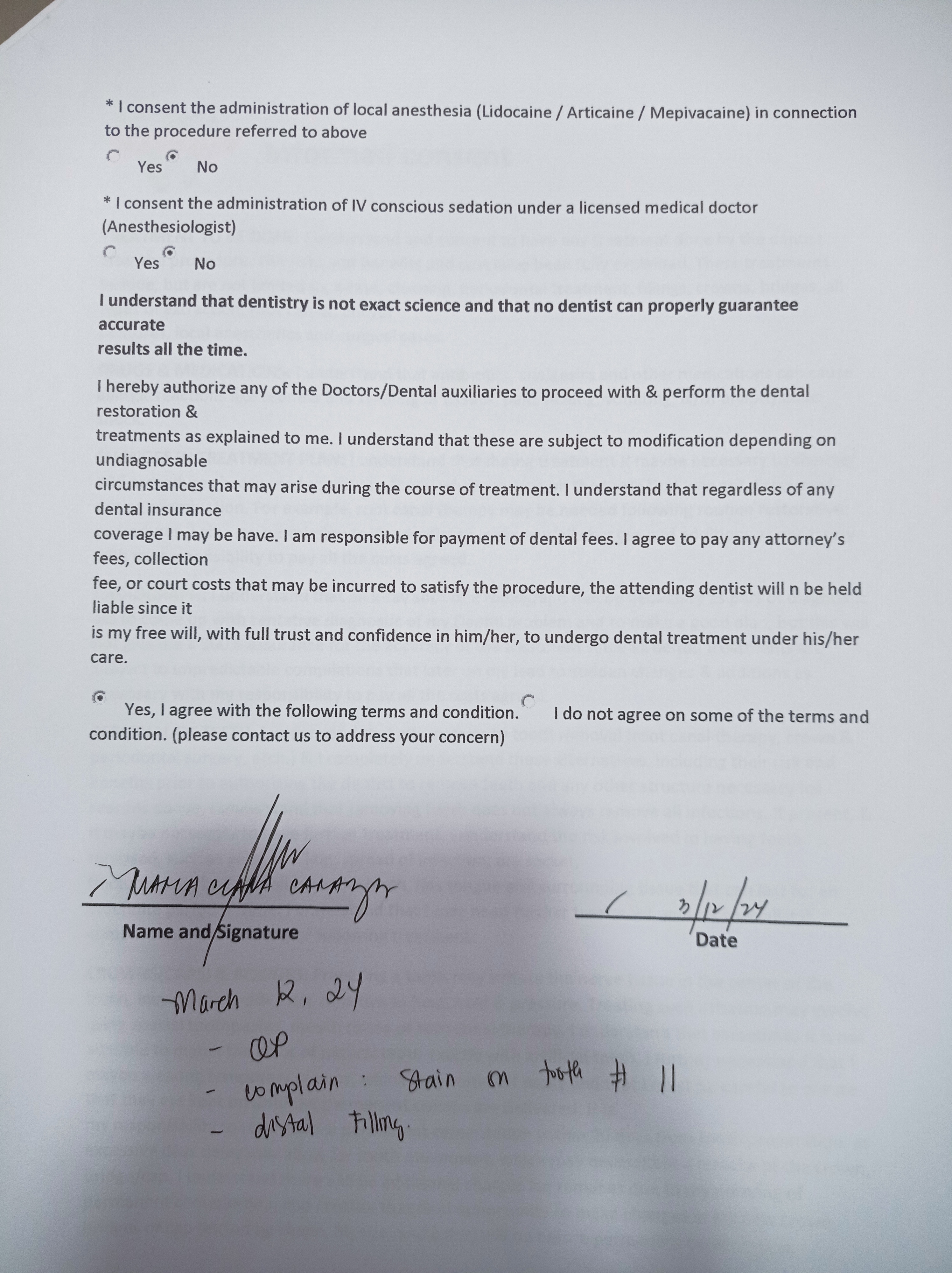 - 03/12/24 OP complain stain on tooth #11 distal filling