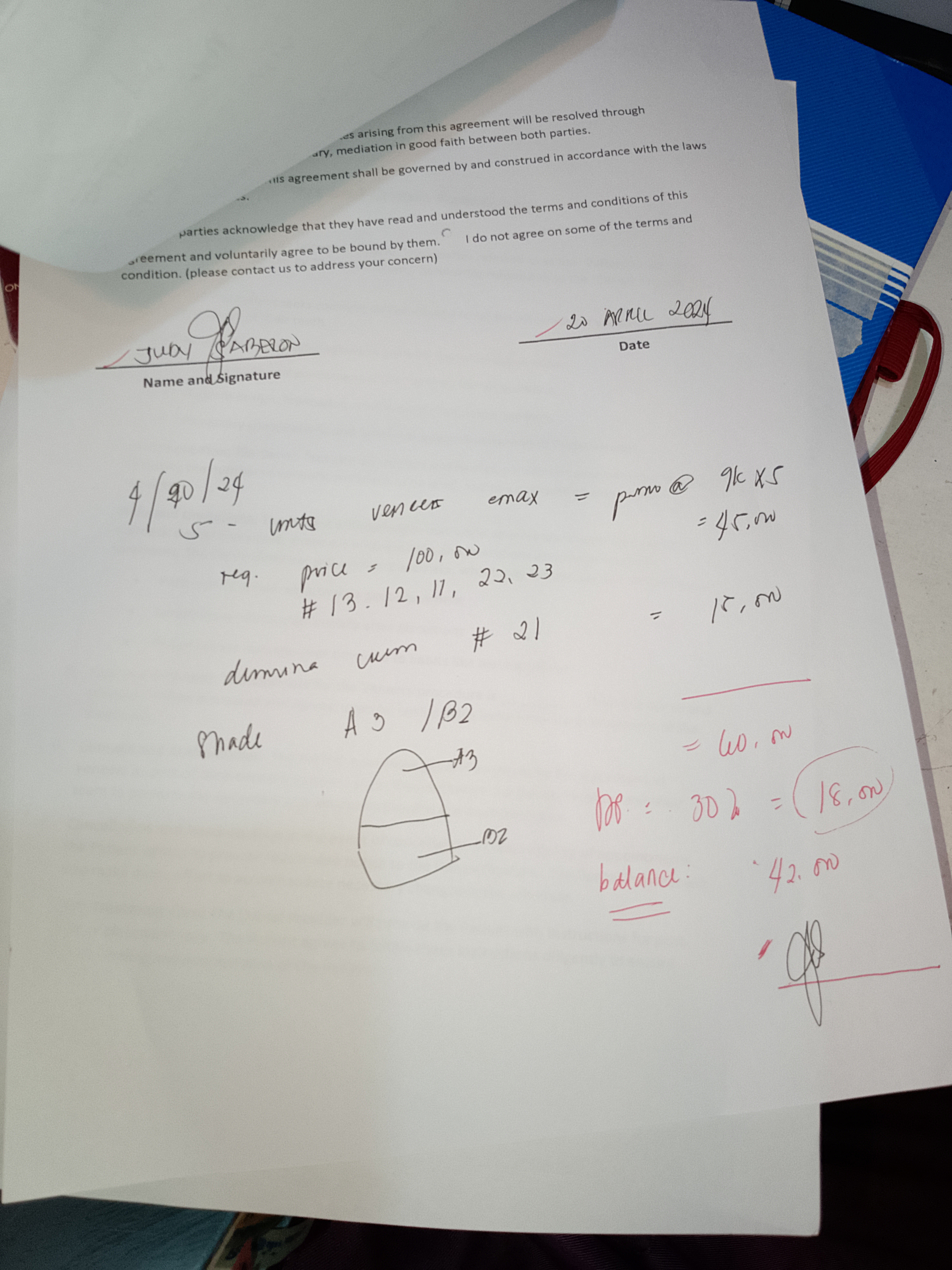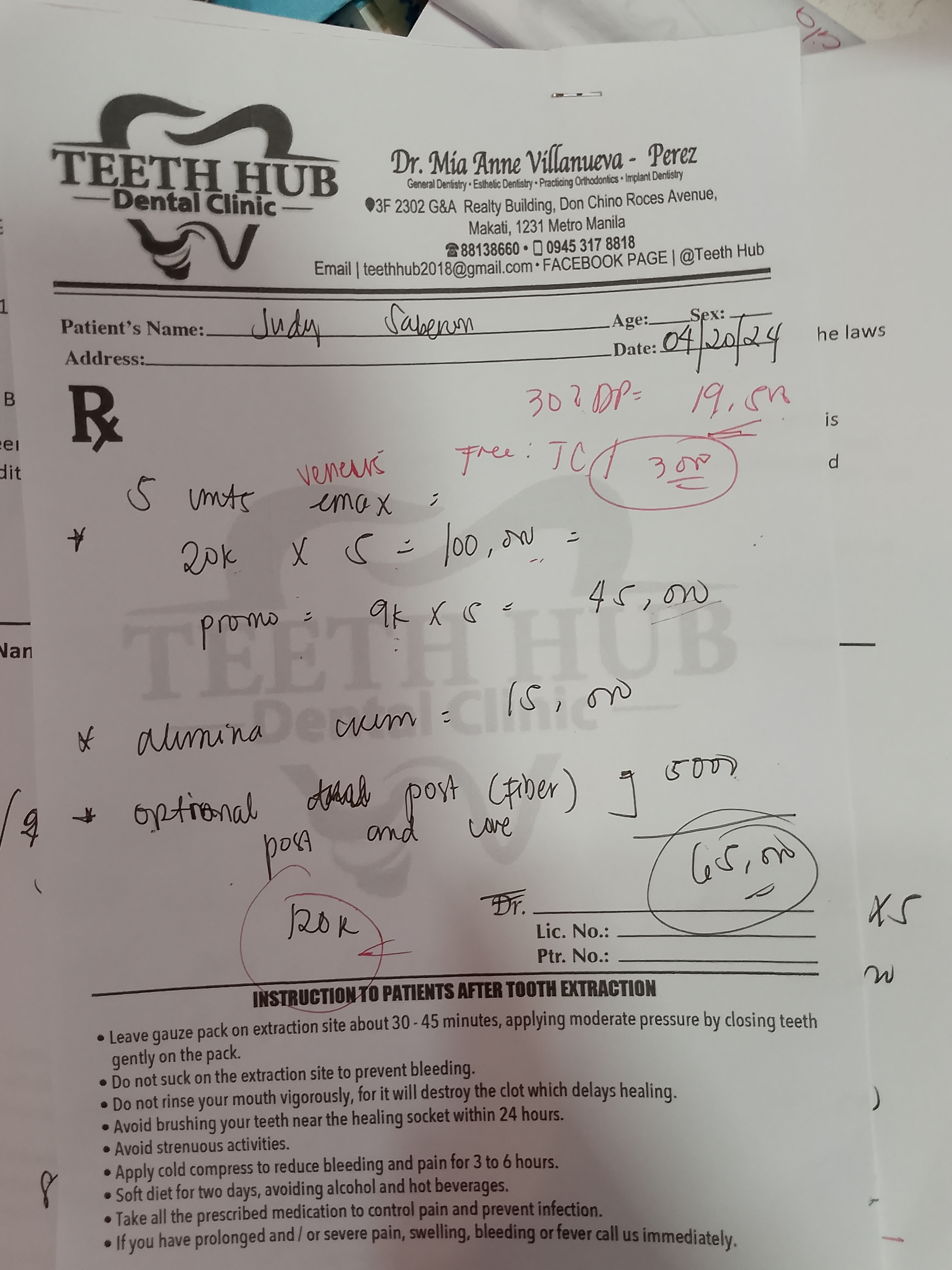 - 04/20/24 5 units veneer emax promo@9kx5... 45.000 #13,12,11,22,23 Alumina Crown #21 .. 15,000 shade A3/B2 04/25/24 installation of veneers #13-23 shade A3 Alumina crown on 21 material alumina