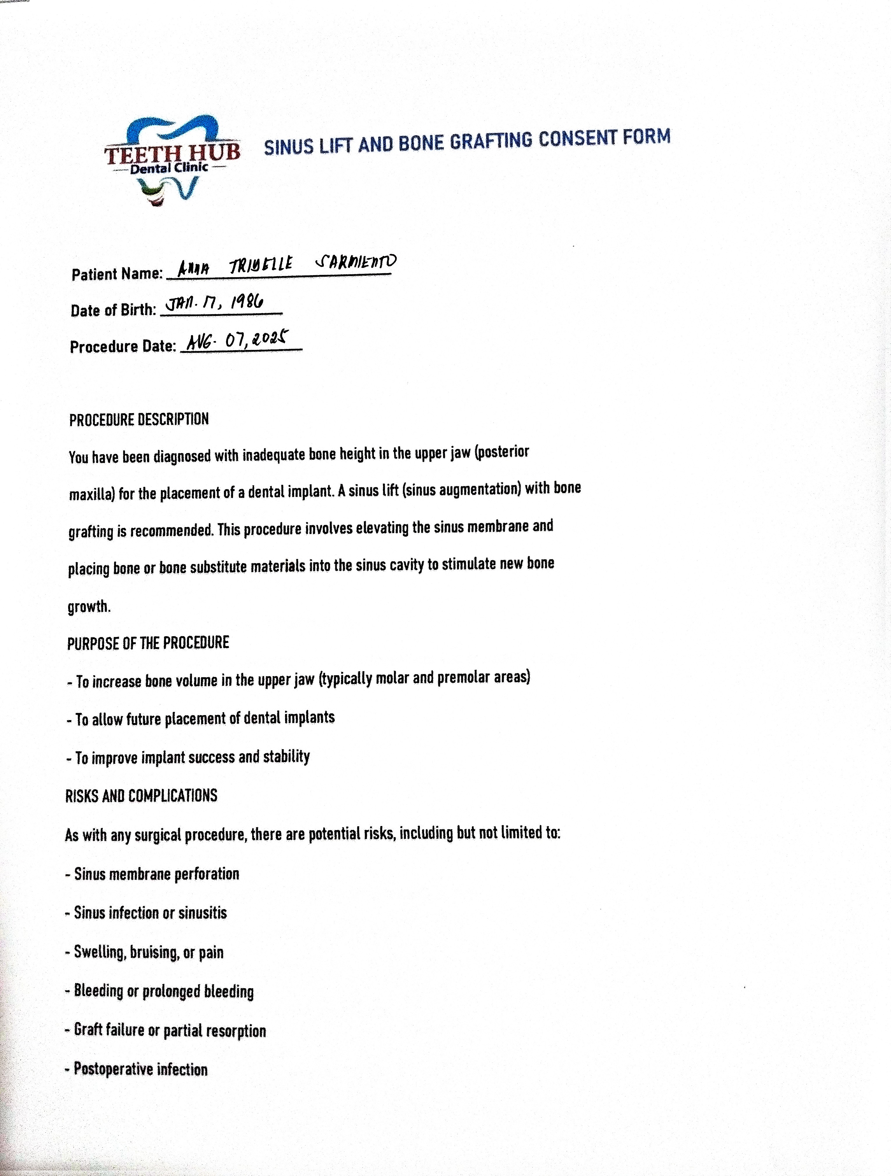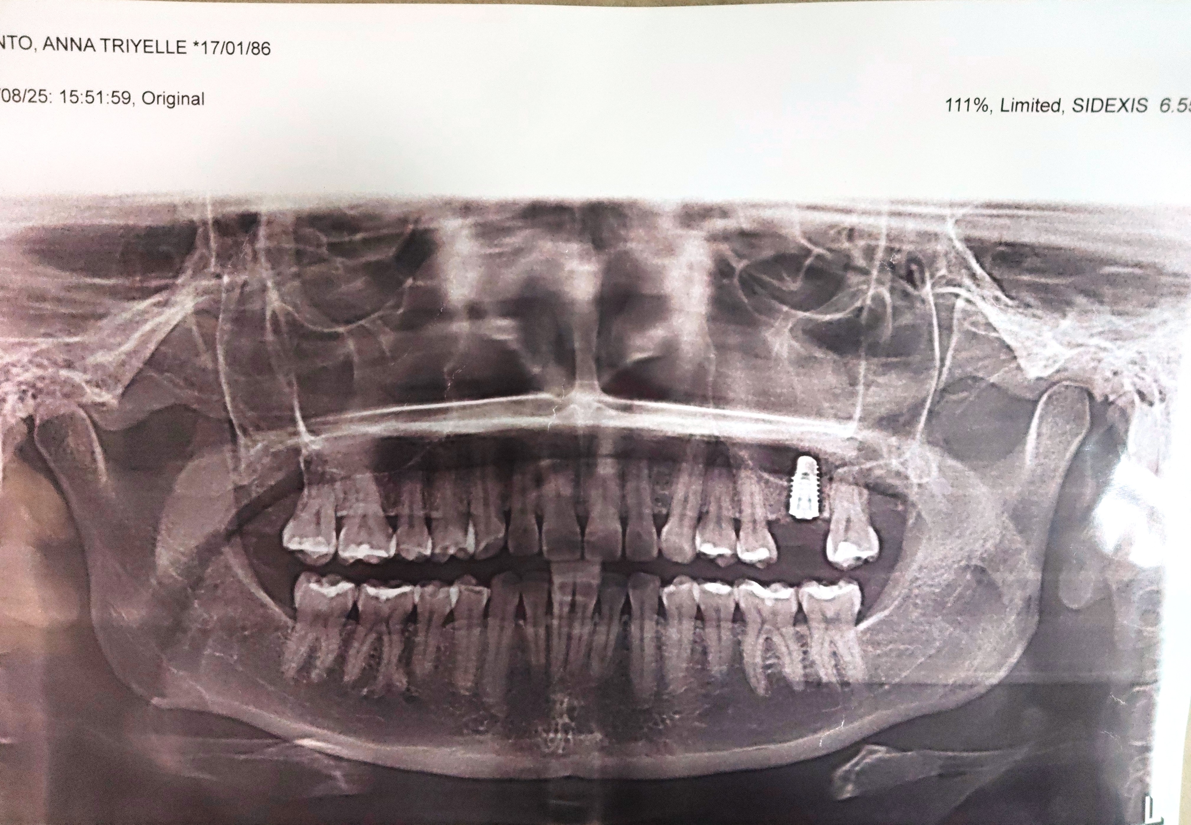 - 06/21/25 OP mild 08/07/25 Implant #26 size 5.3x 10mm IT with screw cover DO bone- cortical and cancellous bone 1cc membrane Titan guide 15x20mm *sinus perforation 2 tubes cgf 10 tubes PRF lidocaine x5 carps RX: celecoxib 400 mg. prednisone 10mg, tranexamic 500mg co-amoxiclav 625mg 10caps, saline spray Odontectomy #18/ 28 08/19/25 RECALL 11/12/25 RECALL 11/18/25 HA installed 5.3mmx2mm after 3 weeks. laser implant location 01/10/26 scanning for implant crown 01/20/2026 Installed crown Implant + zircomia cement: rely -x