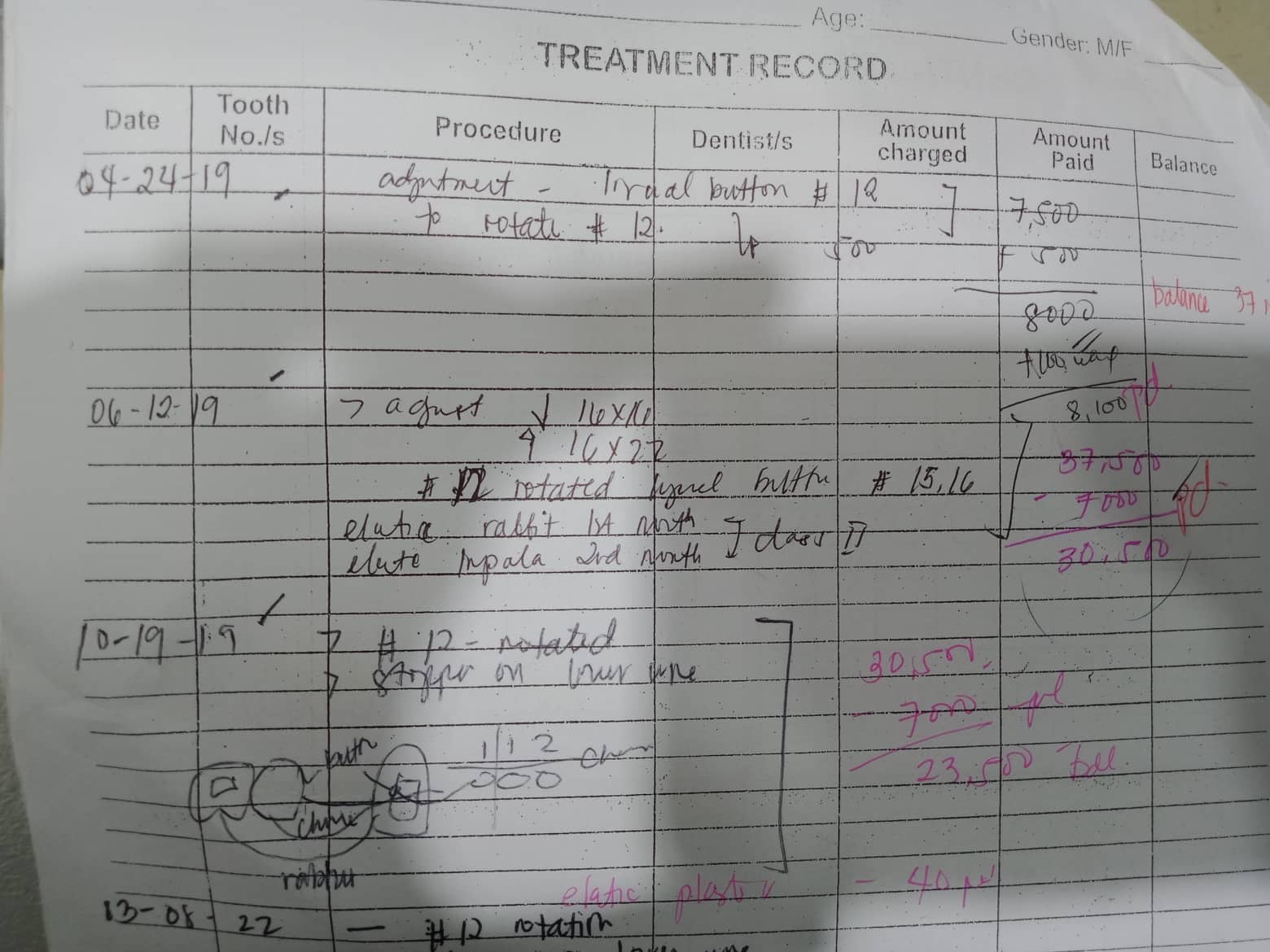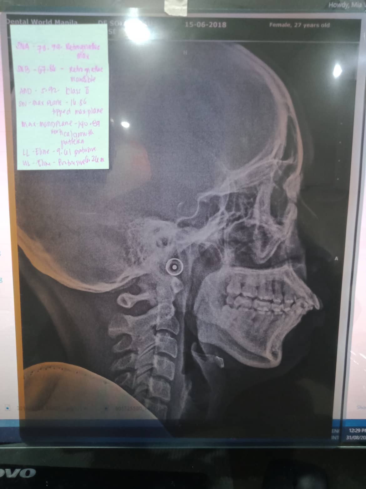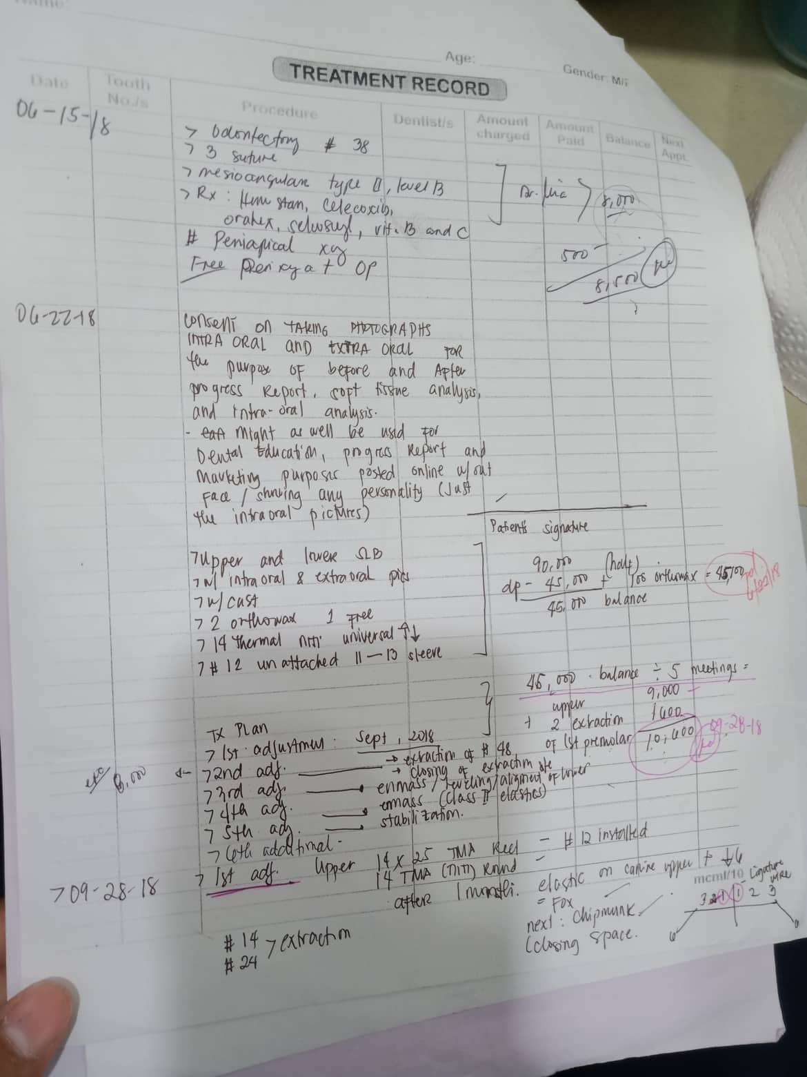 - 03/08/22- adjust/ 12 rotation no stopper lower 16x16 niti upper 114x 25 lower crimpable hook- 12/22 claSS 2 Elastic fox- mar-april penguin- may to june force 2 july- august 04/26/23- Adjust 12/20/23- Same wire >Coil spring #23 (mesialized) >Closing space on upper >Initial elastic- Chipmunk (hook to 26) >2nd Elastic force @ (hook to 36/46) >3rd Elastic Chipmunk (hook to 36/46) 12/07/24 Chain full upper reattched #32 slant e;lastic penguin closing of space on QII